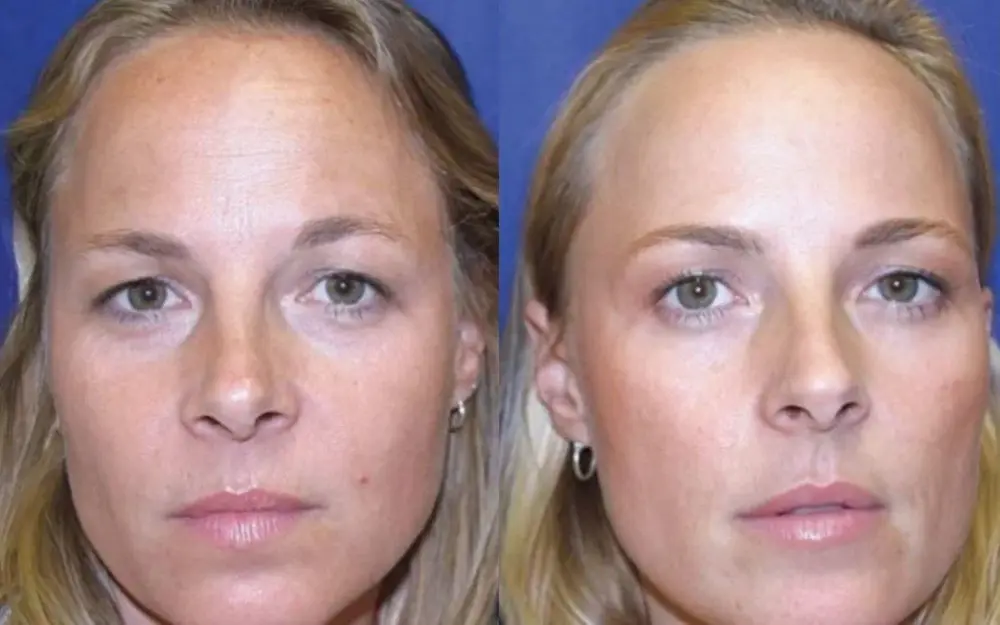 右:13年間にわたり、毎年約2~3回、額(前頭筋)と眉間のしわ(眉間領域)にボトックス注射「予防は治療に勝る」という考えのもと、早めのケアをおすすめしています。
