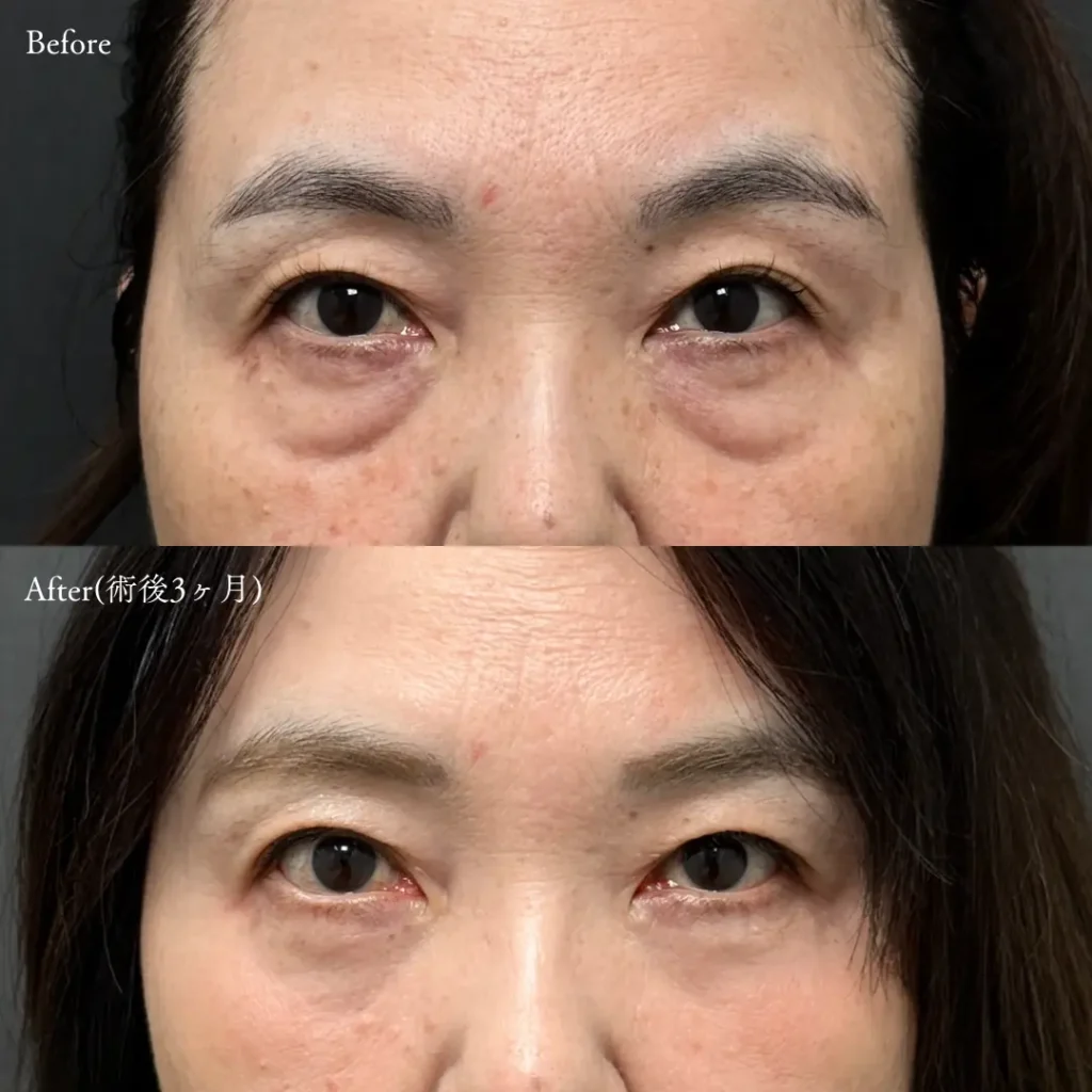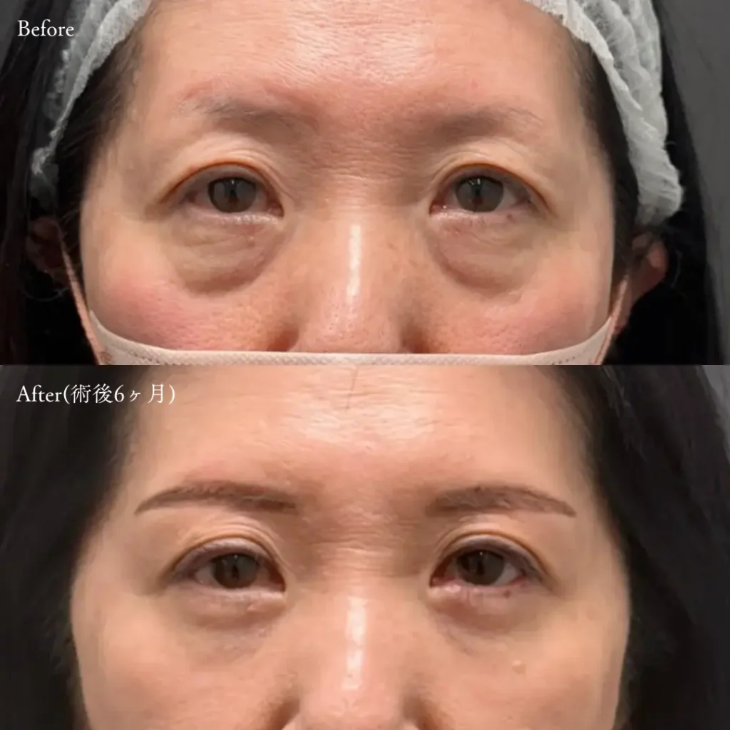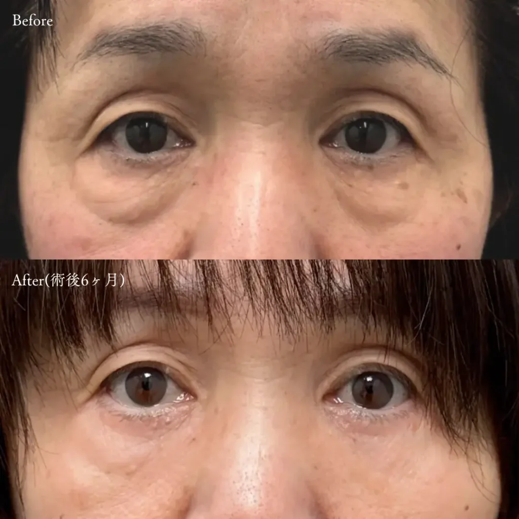 主に目の下のたるんだ余分な皮膚を切除し、同時に必要に応じて眼窩脂肪の除去(脱脂)や眼輪筋の引き締めを行うことで、目元の若返りを図る手術です。