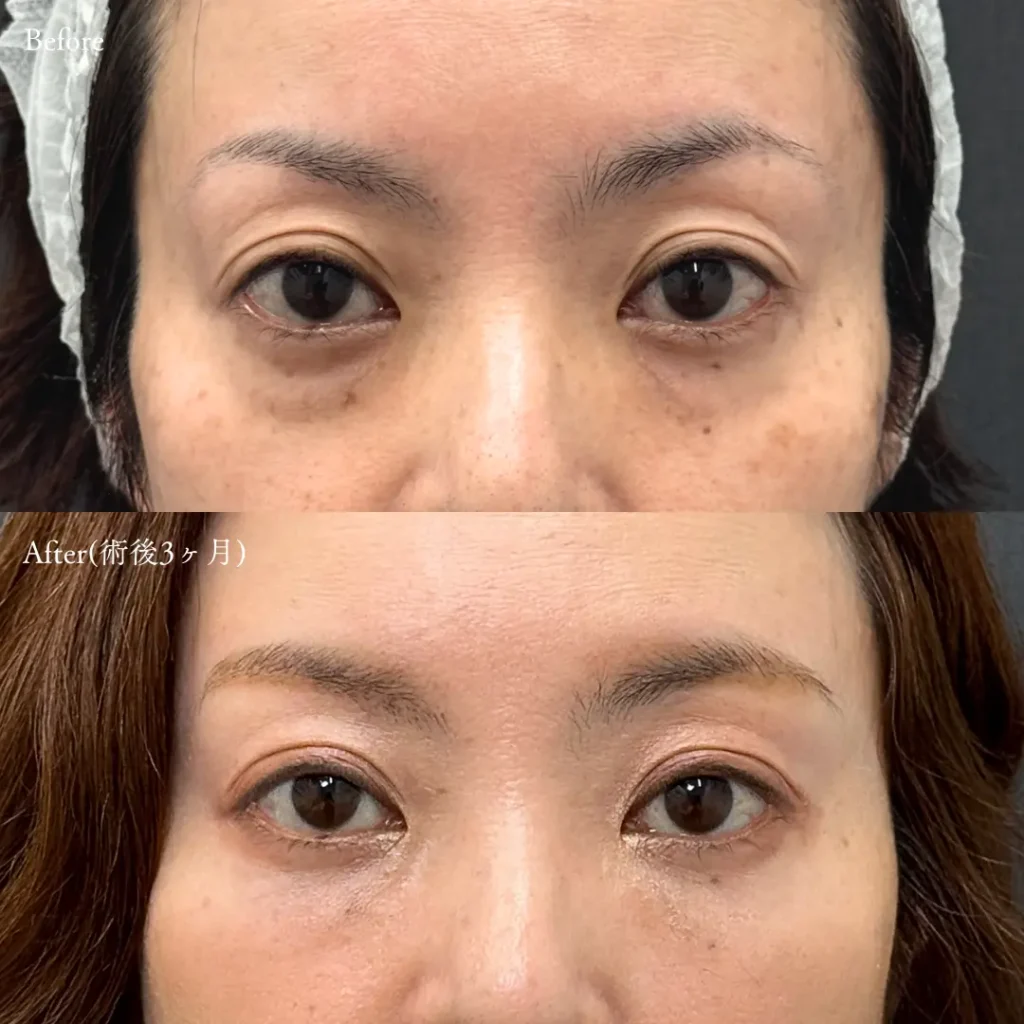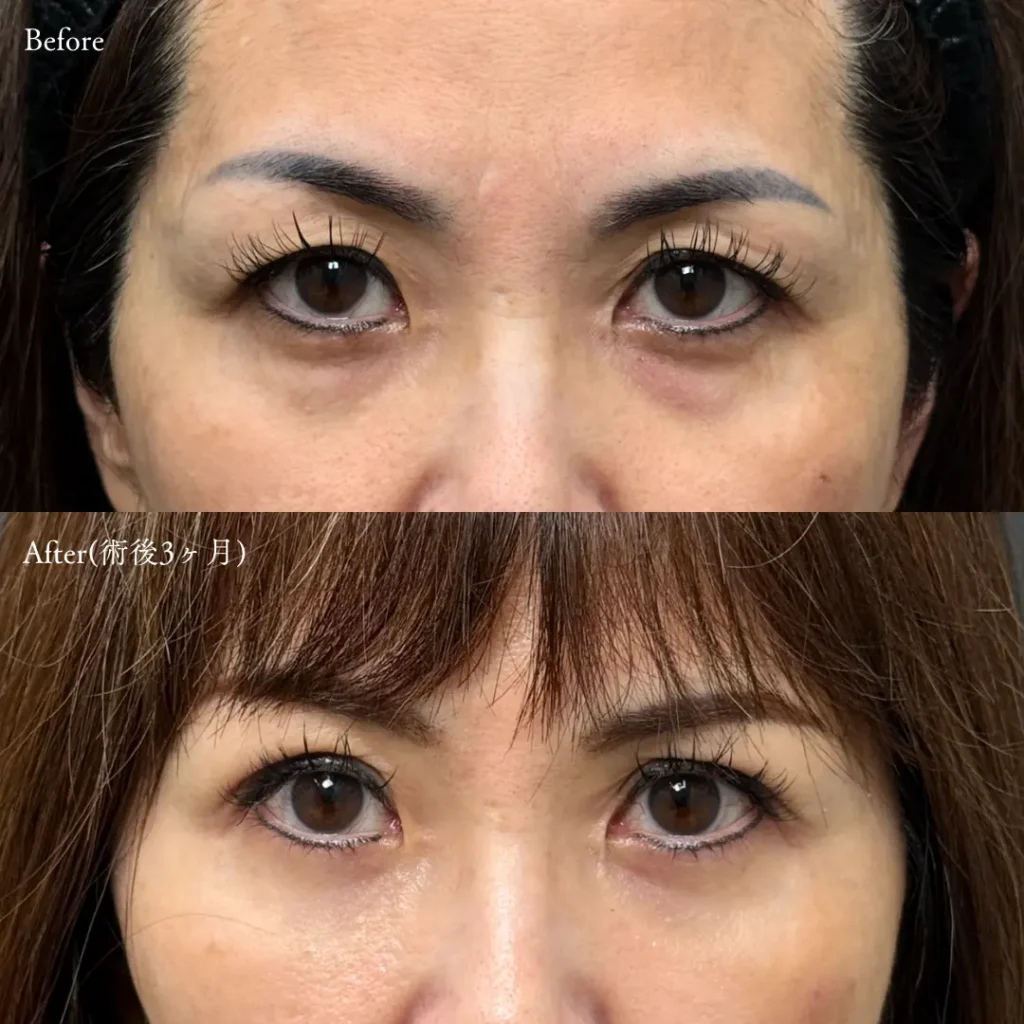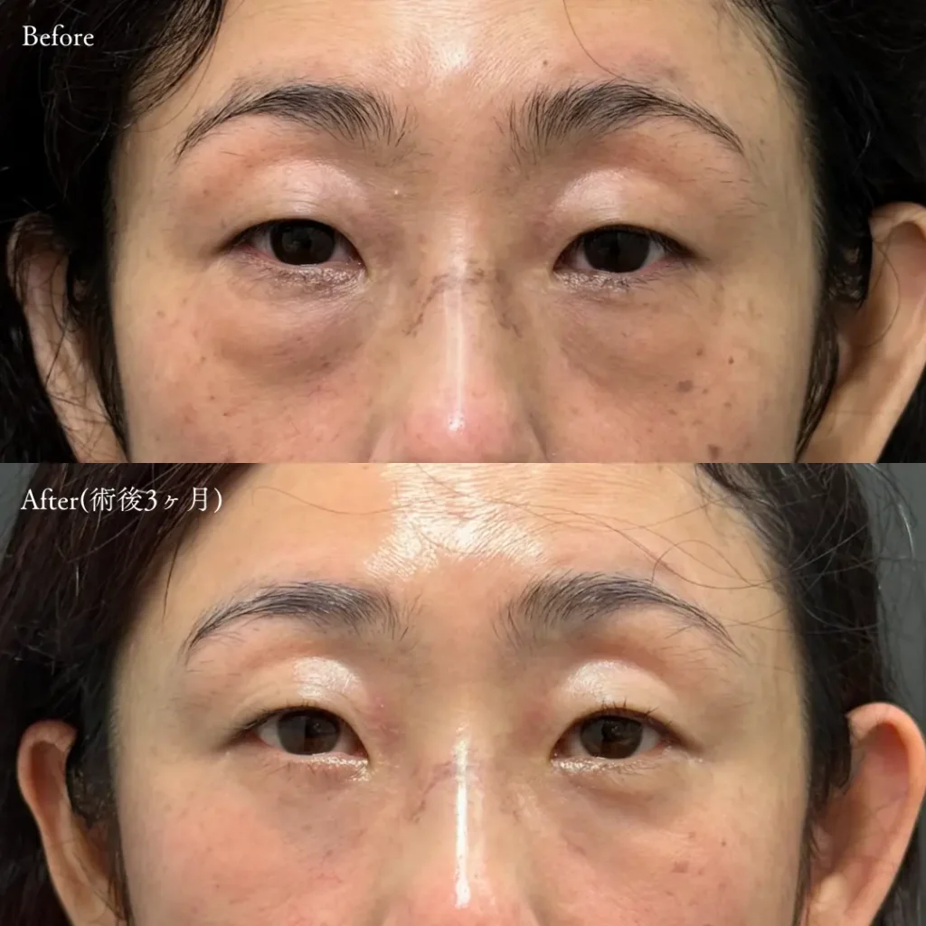 主に目の下のたるんだ余分な皮膚を切除し、同時に必要に応じて眼窩脂肪の除去(脱脂)や眼輪筋の引き締めを行うことで、目元の若返りを図る手術です。