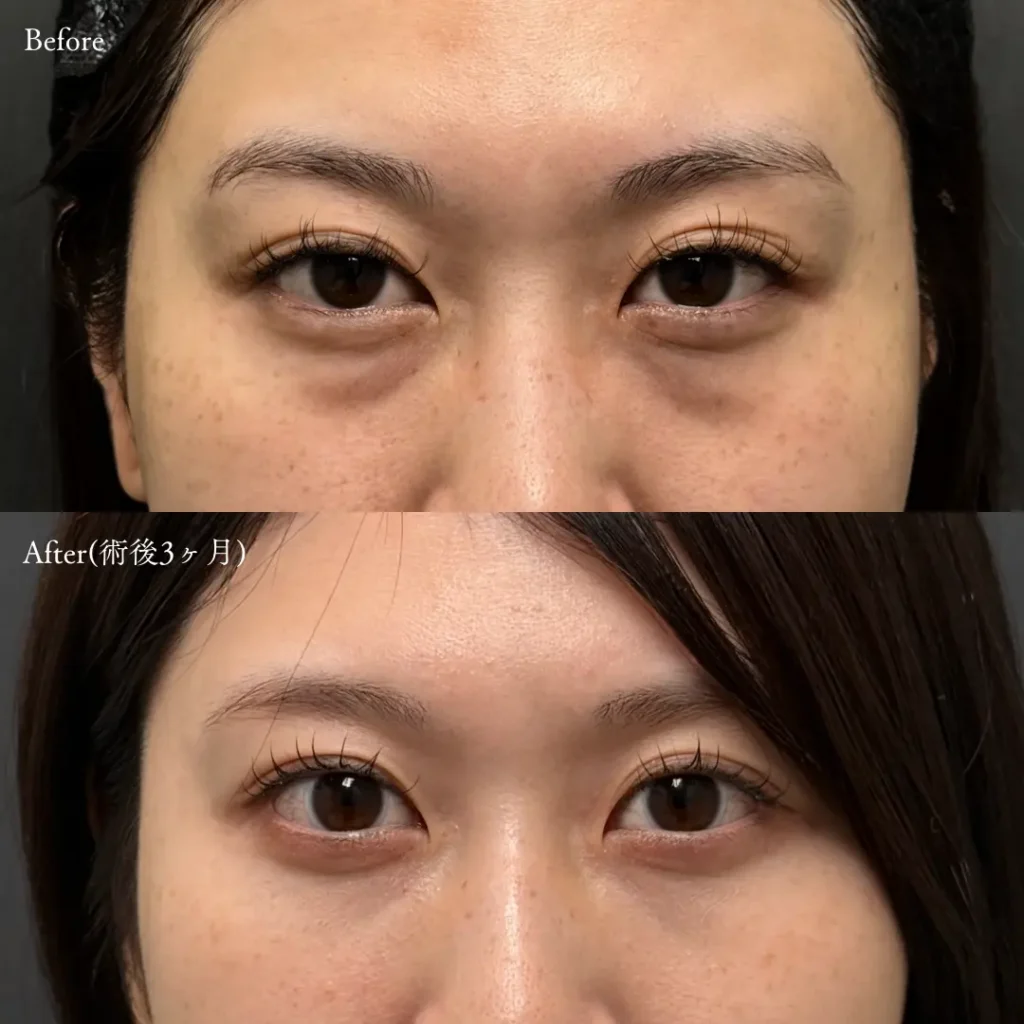 下まつ毛の際で皮膚を切開し、ふくらみの原因である眼窩脂肪をくぼんだ部分へ移動・再配置すると同時に、たるんだ余分な皮膚や眼輪筋の処理も行う手術です。
