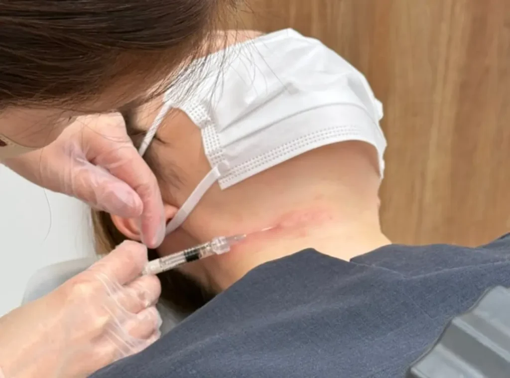 皮膚の浅い層に細かく注入するため、直後は虫刺されのようなボコつき(膨疹)が出ます。首や頬の場合、数時間〜翌日には落ち着くことがほとんどですが、マスクやスカーフの準備をお勧めしています。