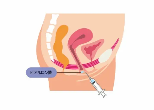 膣内ヒアルロン酸注射とは、膣の入口から奥まで膣壁内にヒアルロン酸を注入し、直接的に膣内腔を狭くすることで、膣の締まりを良くする治療です。膣壁を狭くし圧力を強めるとともに膣内をふっくら肉厚にさせます。