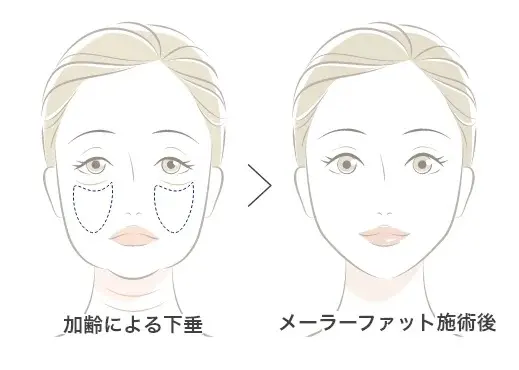 年齢が若いあいだには頬骨の位置にありますが、加齢とともに下垂していきます。ほうれい線が目立つ原因になるだけでなく、眼窩脂肪との間に皮膚の凹みが生じ、老けて見える原因となります。
