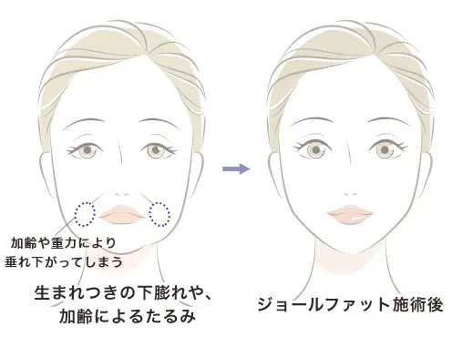頬の膨らみやボリュームの原因となり、この脂肪が多いことでほうれい線が目立ちます。