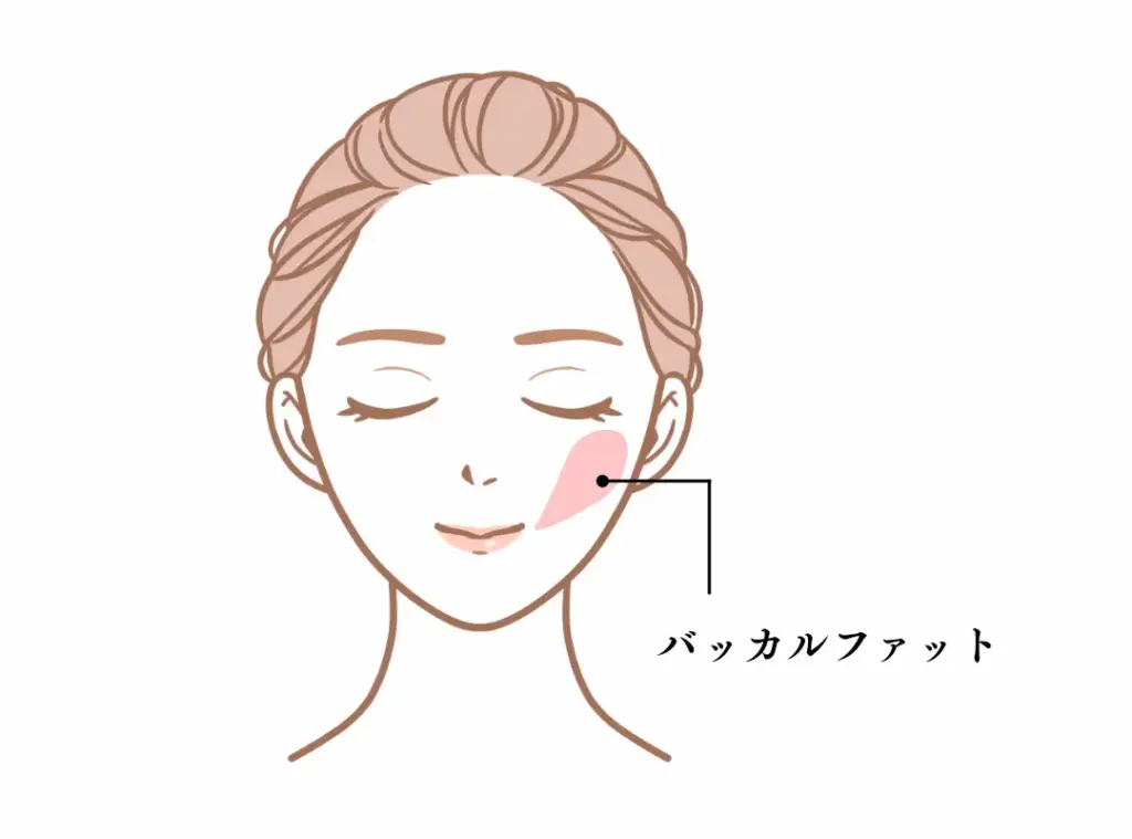 バッカルファットとは、頬の深い層にある、卵の黄身ほどの大きさの脂肪の塊です。若い頃は頬の高い位置にあり、生まれつき量や大きさは決まっています。笑った時にぼこっと出る部分や、幼少期からの下膨れは、このバッカルファットが原因のことが多いです。