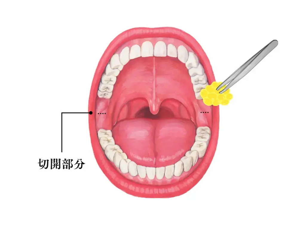 頬の内側の粘膜(奥歯の近く)を5mm~1cmほど、小さく切開し、その小さな切開部分から、原因となっているバッカルファットを優しく引き出します。お口の中の粘膜は傷の治りが早いのが特徴です。