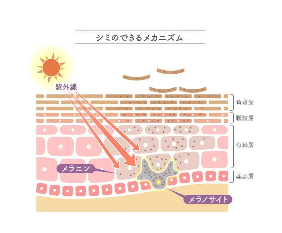 お肌が紫外線を浴びると、シミの原因となる「メラニン色素を作りなさい」という指令がメラノサイトという細胞に出されることによりシミが作られ始めます。