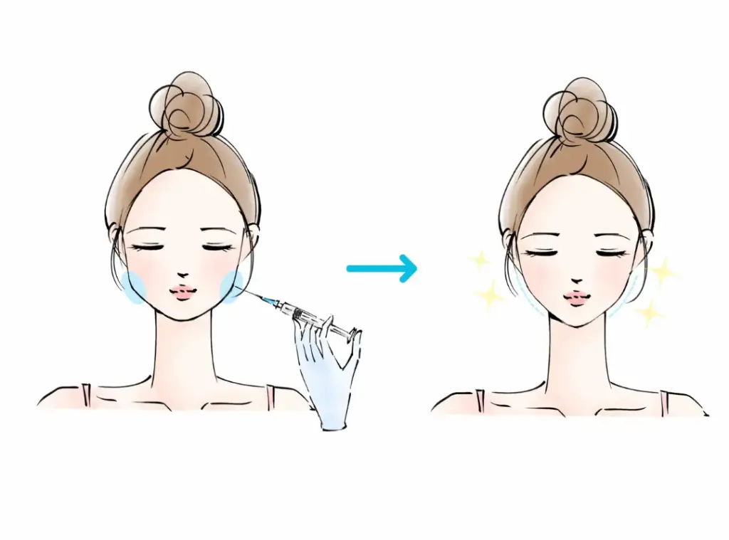 ボツリヌストキシンというタンパク質の一種を、肥大した唾液腺(耳下腺・顎下腺)に直接注入します。この薬剤が唾液腺の過剰な働きを一時的に抑制することで、肥大した腺組織が徐々に小さくなり、フェイスラインがすっきりと整います。